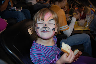 Ruby was so excited to see the clowns, but she was very upset that there weren't any girl clowns. She got her face painted as a Tigress (a girl tiger), and was enthralled by the acrobats on the flying trapeze. She loved the baby elephant (and the four year old girl who was in the elephant act). But, she was not happy about the woman who walked on a horse's back ("that's not nice, mommy!).